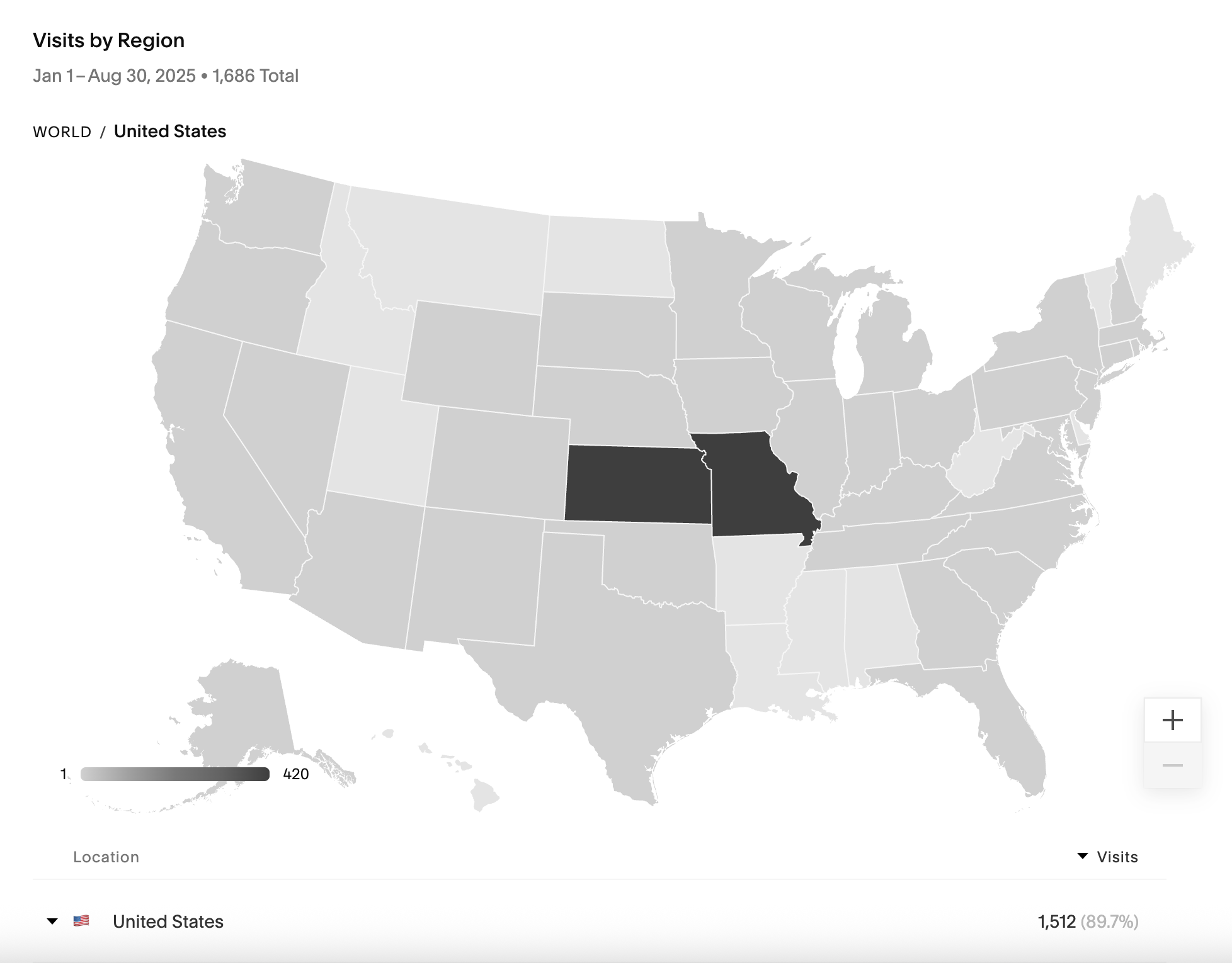 Geographic data shows that website traffic is most concentrated in Kansas and Missouri—the two states Modern Gastroenterology serves, validating that the site is reaching its target patient base and that SEO optimization efforts are effectively aligned with the practice’s geographic footprint