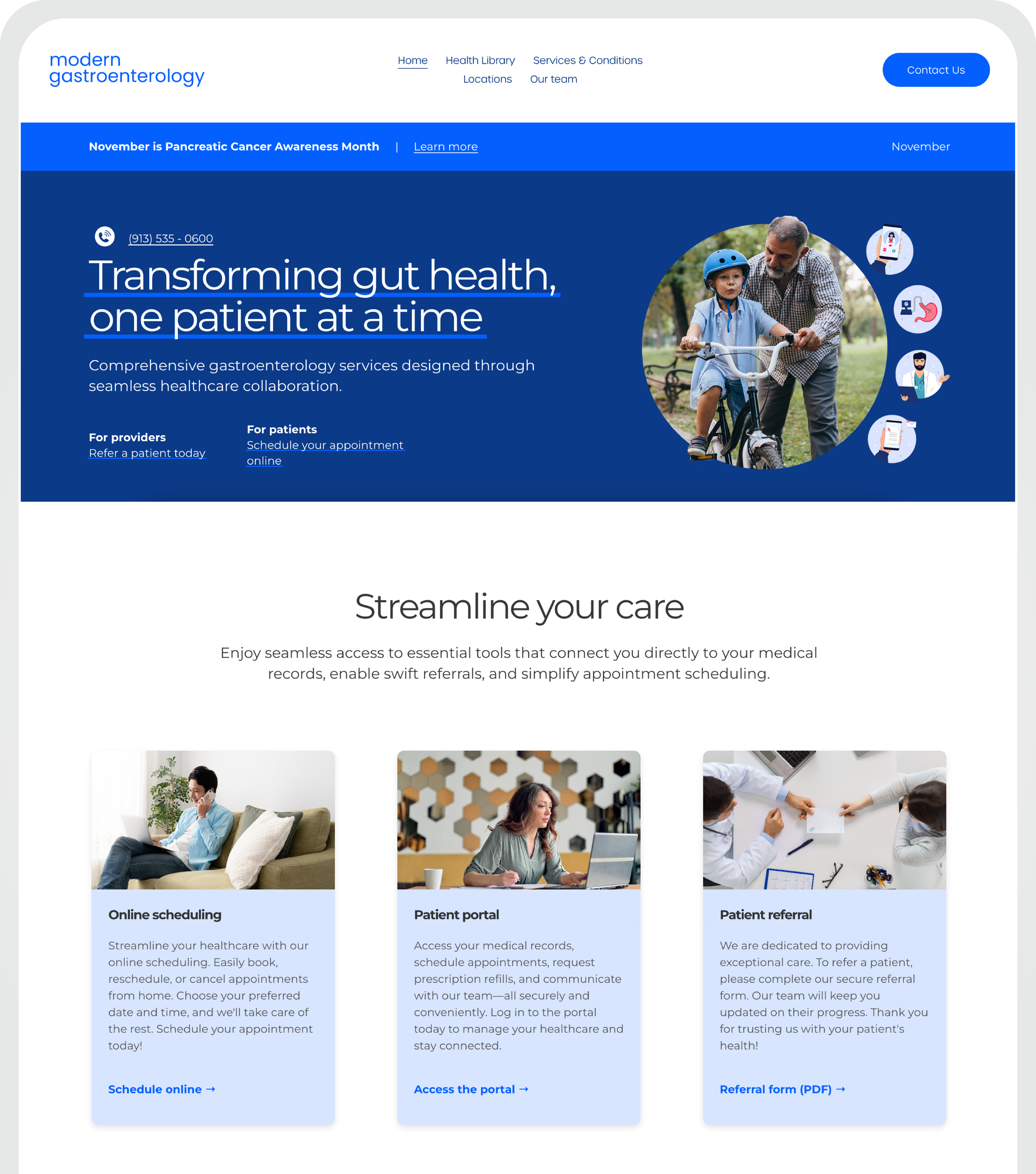 Before this project, Modern Gastroenterology had no online footprint. Patients struggled to find reliable information, and referral forms were challenging to access. I was tasked with building an online experience from the ground up—one that made specialized care approachable, efficient, and aligned with the practice’s mission. Our primary objectives were: